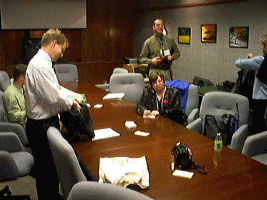 Our focus group finishes its first debriefing meeting. Randy is standing in the background in the dark shirt. We got an impromptu tour of the Hansard office minutes after I took this picture. We had asked this gentleman to take some pictures, and he turned out to be the head of Hansard. He then invited us in to take a look at all the typists and translators. Isn't serendipity wonderful?