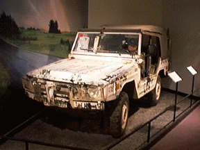 A U.N. peacekeeping jeep that looks a little "shot up."